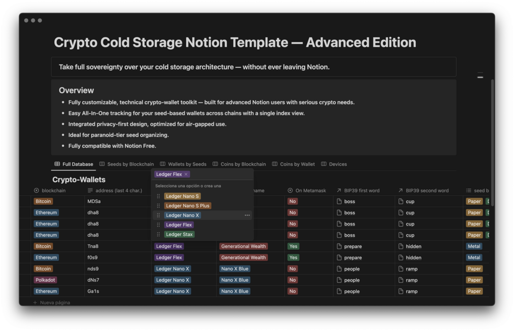 Track your coins, chains, hardware wallet models, and seed backups across multiple blockchains. Ideal for advanced users seeking air-gapped, privacy-first control over their cold storage architecture — directly inside Notion.